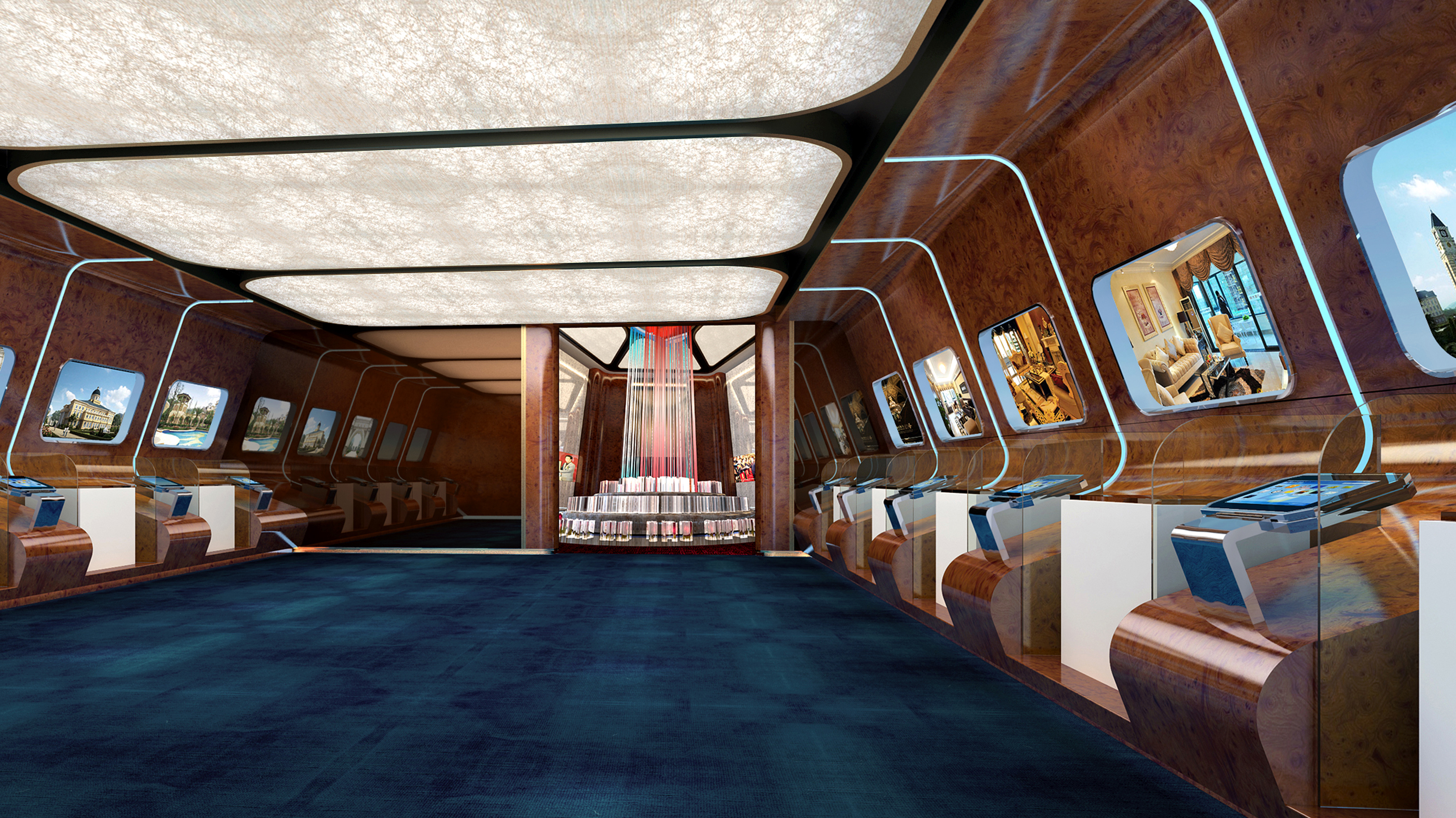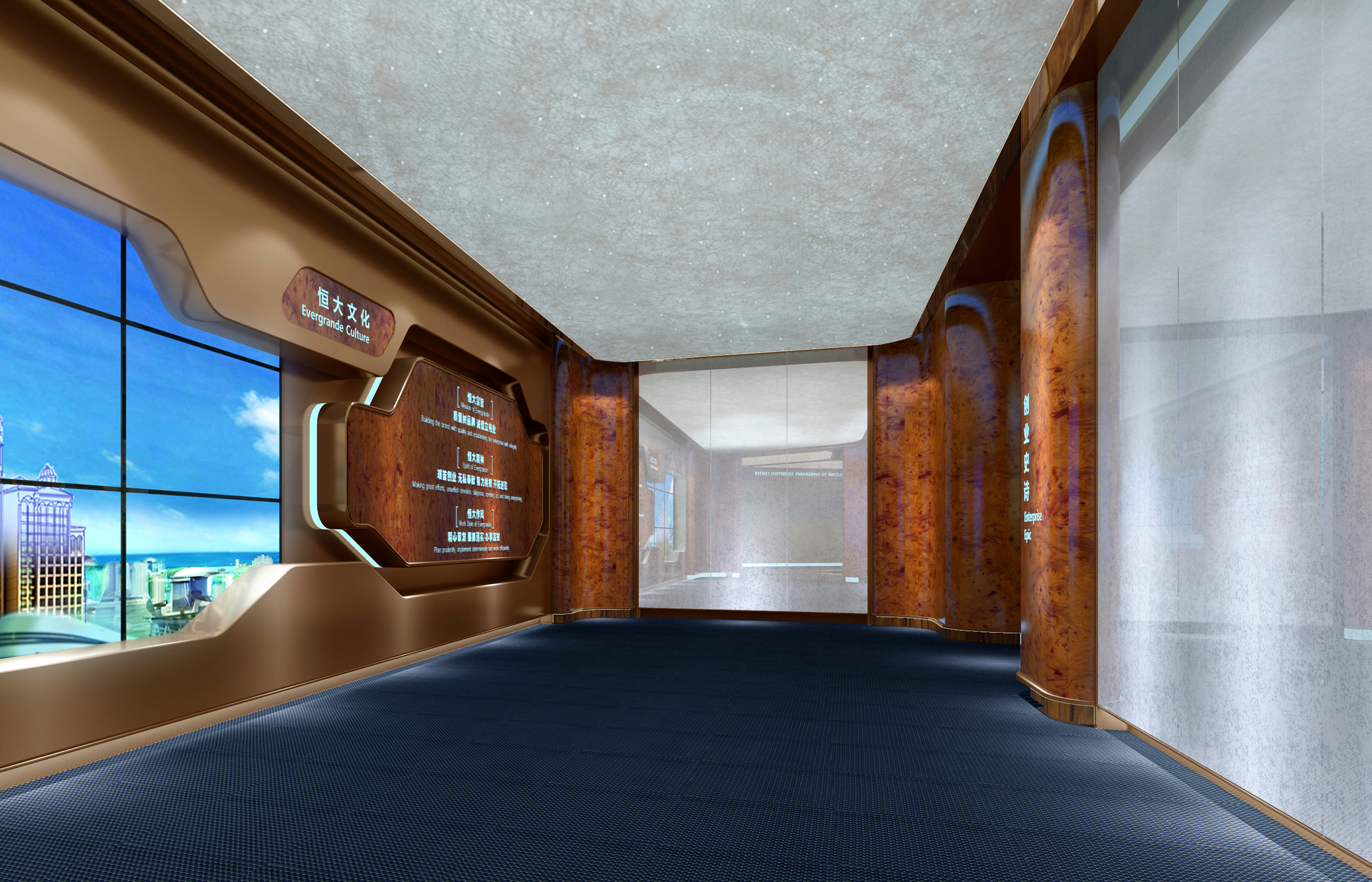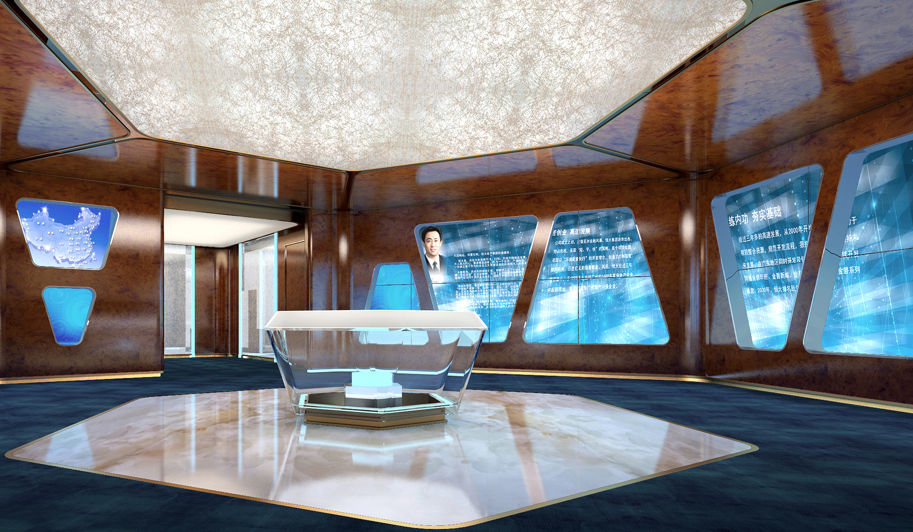 通過模型演示、數據展示、視頻、圖文及交互觸摸等多媒體技術搭建了一個“艱苦創業、無私奉獻、努力拼搏、開拓進取”的“百年恒大”,體現了其在明生地產等多領域追求的專業、極致和領導力。科技化的搭配下,融合歐美的設計風格,空間冷靜而注重細節。
