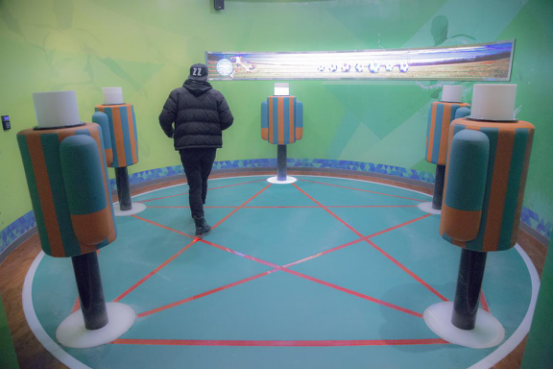 設計靈感來源于傳統的足球搶圈游戲,通過穿梭在人形柱地面的流光模擬足球的傳球,運用感應技術可實現搶斷球等功能。