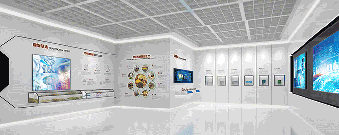 設置可陳列重要原材料的展臺,供參觀者觸摸觀察,并在展臺對應的墻面設置了大尺寸led顯示器,可同時介紹中藥合作商,表達精華制藥產品原料貨真價實。