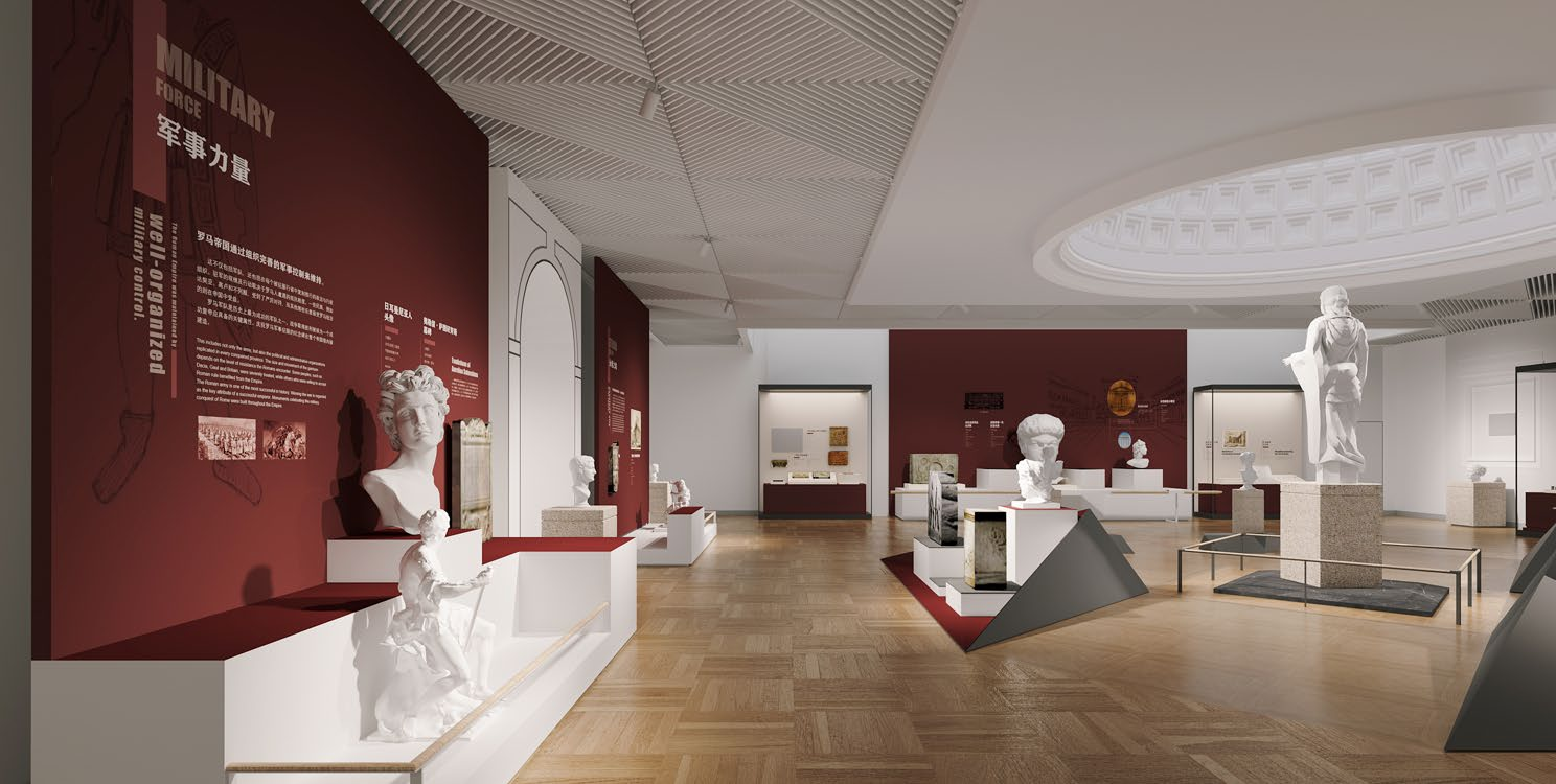 展廳運用了紅、黃、白的色調,鮮明區分展覽的敘述章節;古羅馬建筑元素和AR實景互動帶領人們一秒穿越古羅馬,追溯“永恒之城”羅馬的起源發展,了解疆域廣闊的羅馬帝國如何輻射歐亞非文明的過程。