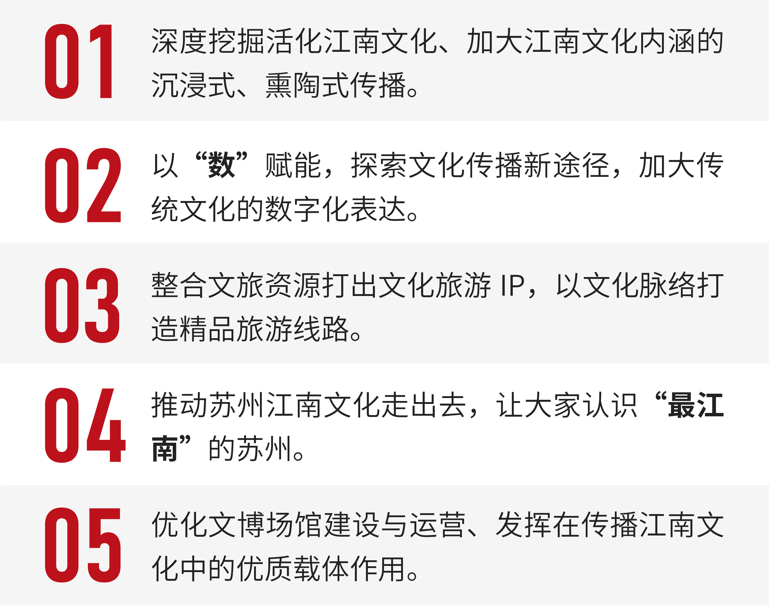 近年來,蘇州文化產業發展迅猛。對于深度挖掘江南文化,助力江南文化轉型升級,楊震提出五點建議: