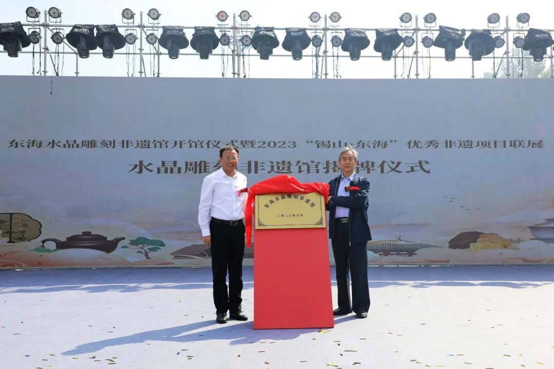 9月20日,東海水晶雕刻非遺館開館儀式暨2023“錫山·東?!眱炐惴沁z項目聯展舉行。國家文旅部原副部長、直屬機關黨委書記??巳剩B云港市副市長、東??h委書記宋波共同為東海水晶雕刻非遺館揭牌。