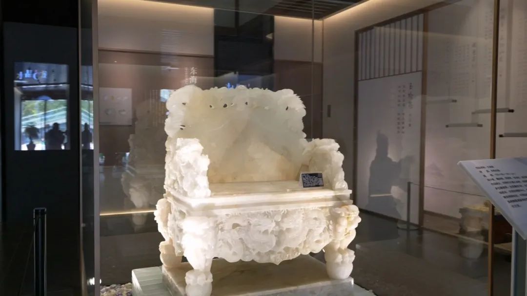 進入序廳,中心位置是展館之最“仿古水晶九龍椅”,之后是東海水晶雕刻傳承人譜系、水晶詩詞多媒體、水晶的形成與郯廬地震遺址等內容展示。