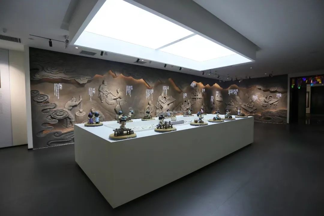 中心桌上打造IP卡通人物模型古代水晶雕刻技藝十二圖技法展演,刻畫了雕琢匠人操作的場面并備注操作說明,可以通過VR眼鏡看到動態的雕琢場景,體現講習互動、展示體驗等非遺傳承功能。